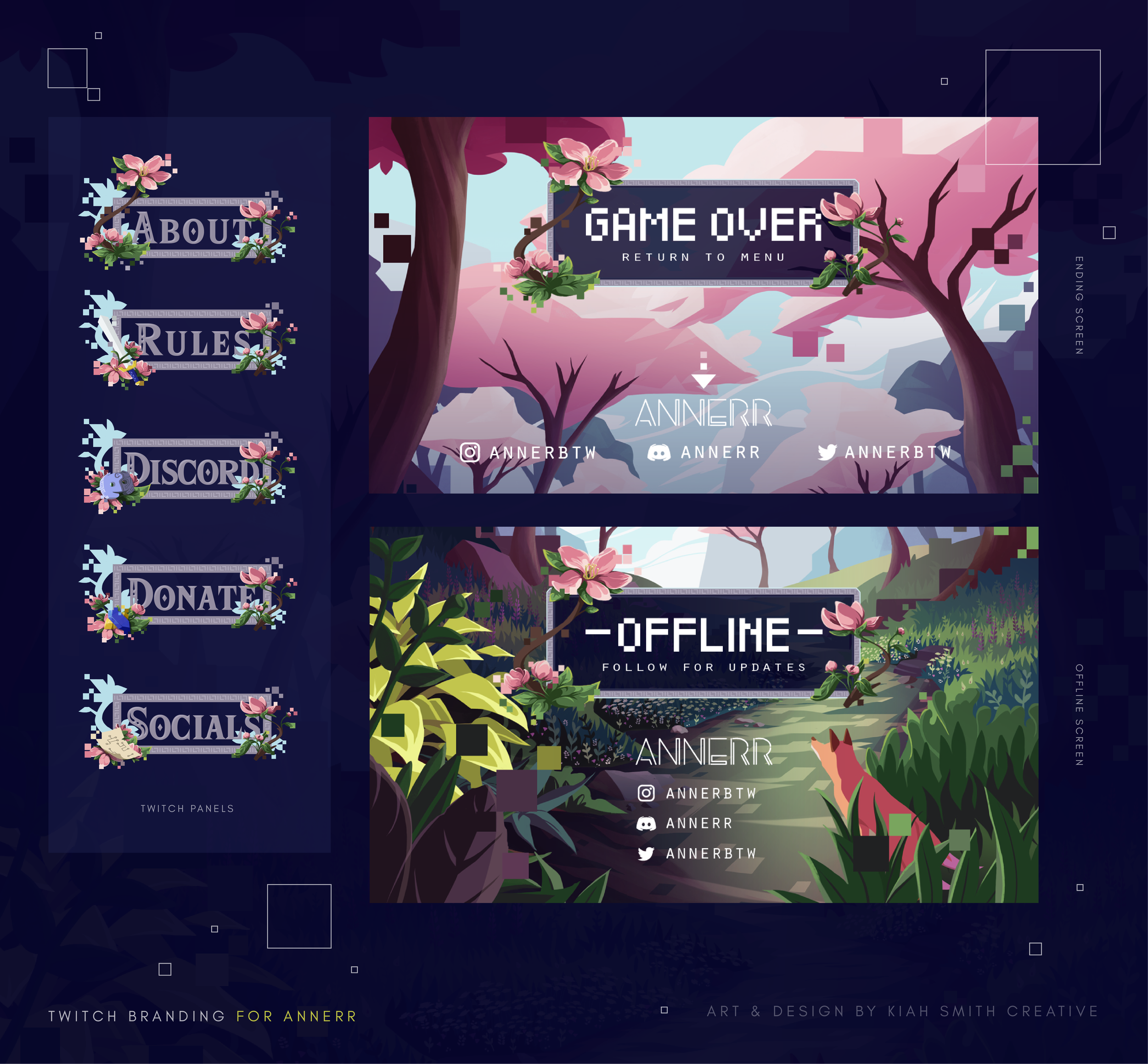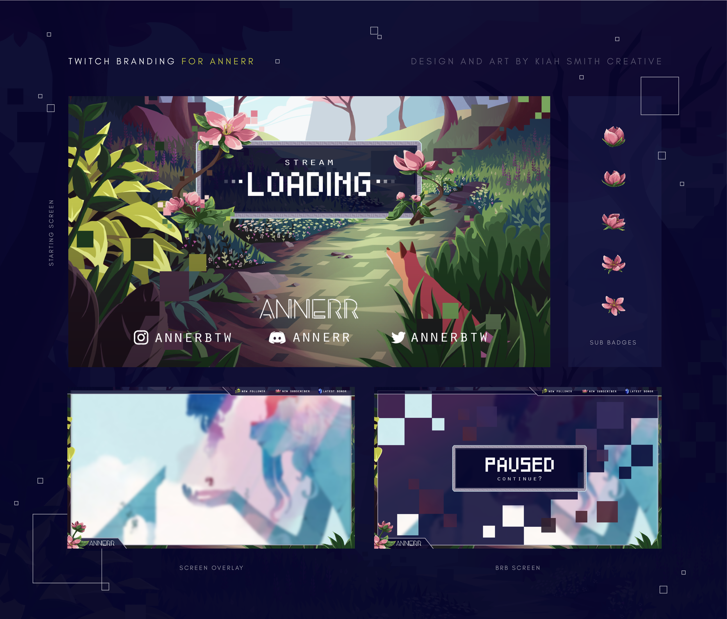 Annerr is a streamer on Twitch with a passion for retro games. We worked together to develop a Legend of Zelda-inspired theme for her channel. Her visual identity features a pixel-like style for the illustration and actual pixel art for the sub badges.